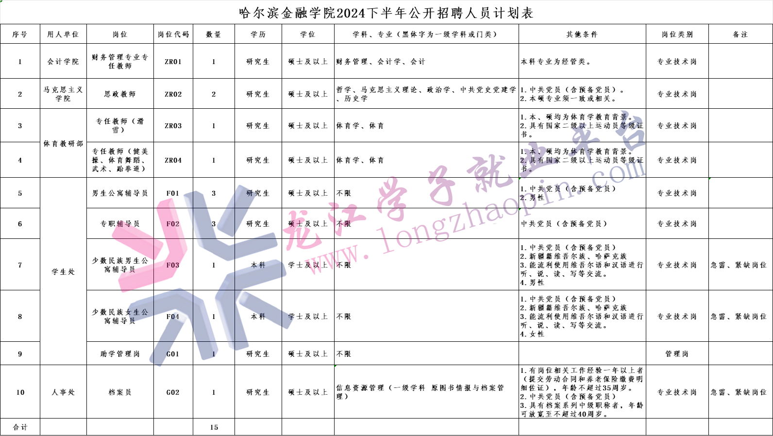 招聘人數(shù)詳見附件1-《哈爾濱金融學(xué)院2024下半年公開招聘人員計(jì)劃表》。