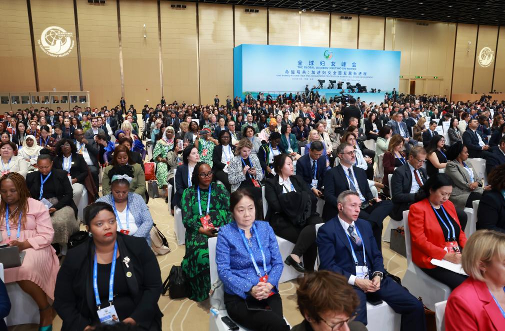 ??國家會議中心,不同膚色、語言和文化交融。全體會議會場外,“華韻承芳·非遺共賞”女性主題特展前,各國代表流連于精美中式作品間,感受東方文明之美;會場內,穹頂燈光如星河傾瀉,精彩發(fā)言引發(fā)共情共鳴,掌聲陣陣。